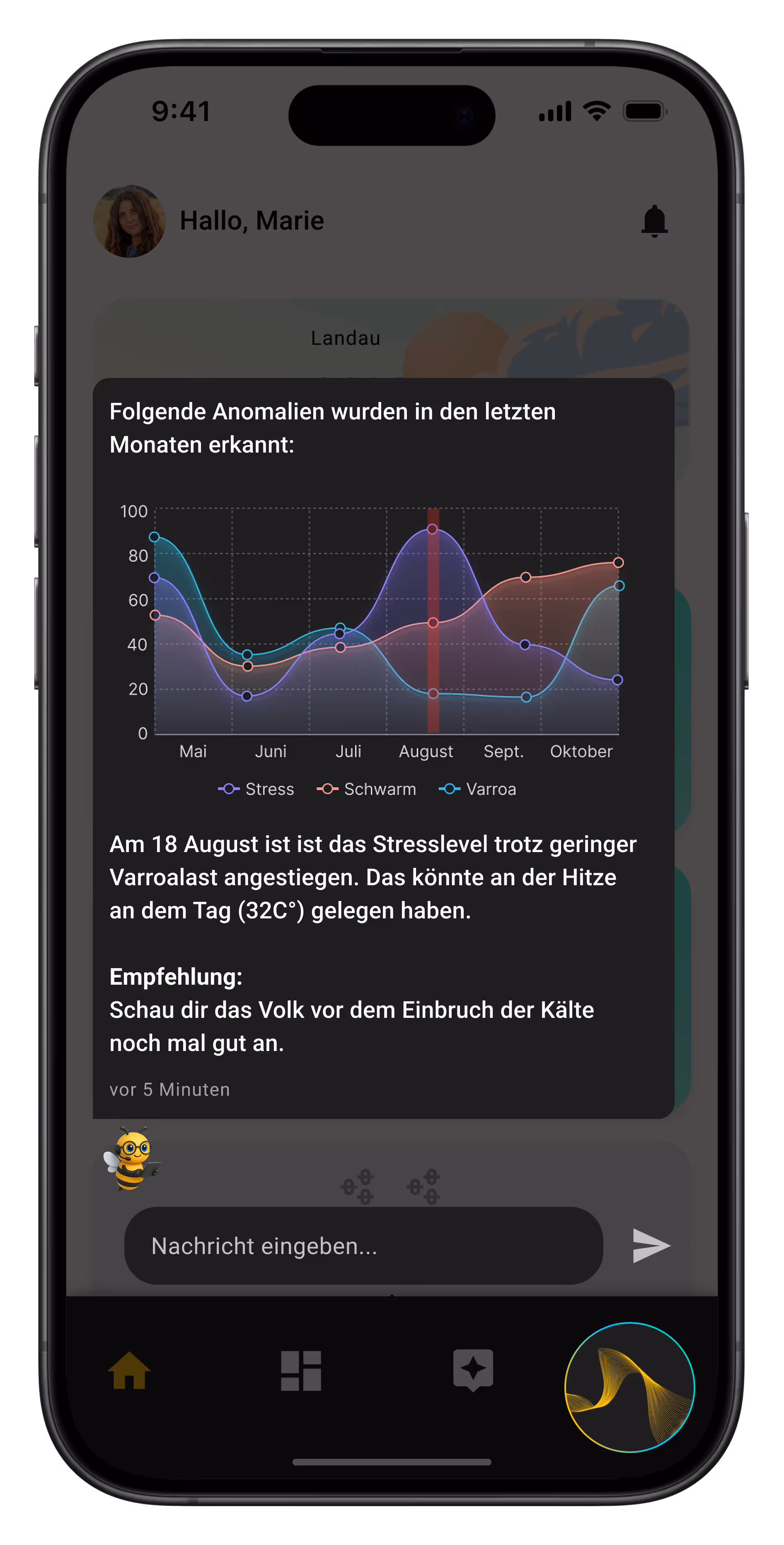 Durch die Kombination von Wetter-, Blüh-, Imkerei- und Sensordaten arbeiten wir daran dir personalisierte Auskunft Handlungsempfehlungen zu deiner Imkerei zu geben. Das alles, mit kinderleichtem Zugriff über unseren KI-Assistenten - Fragen statt Suchen.